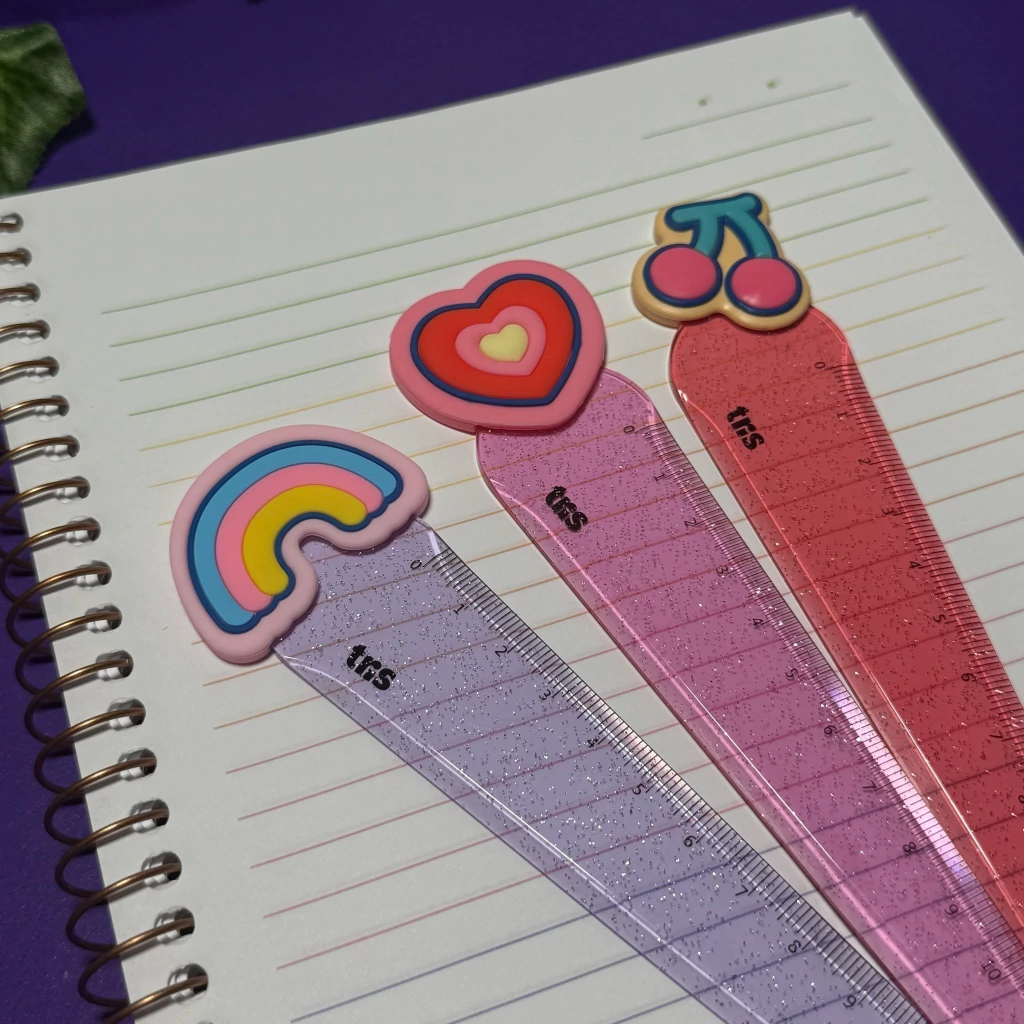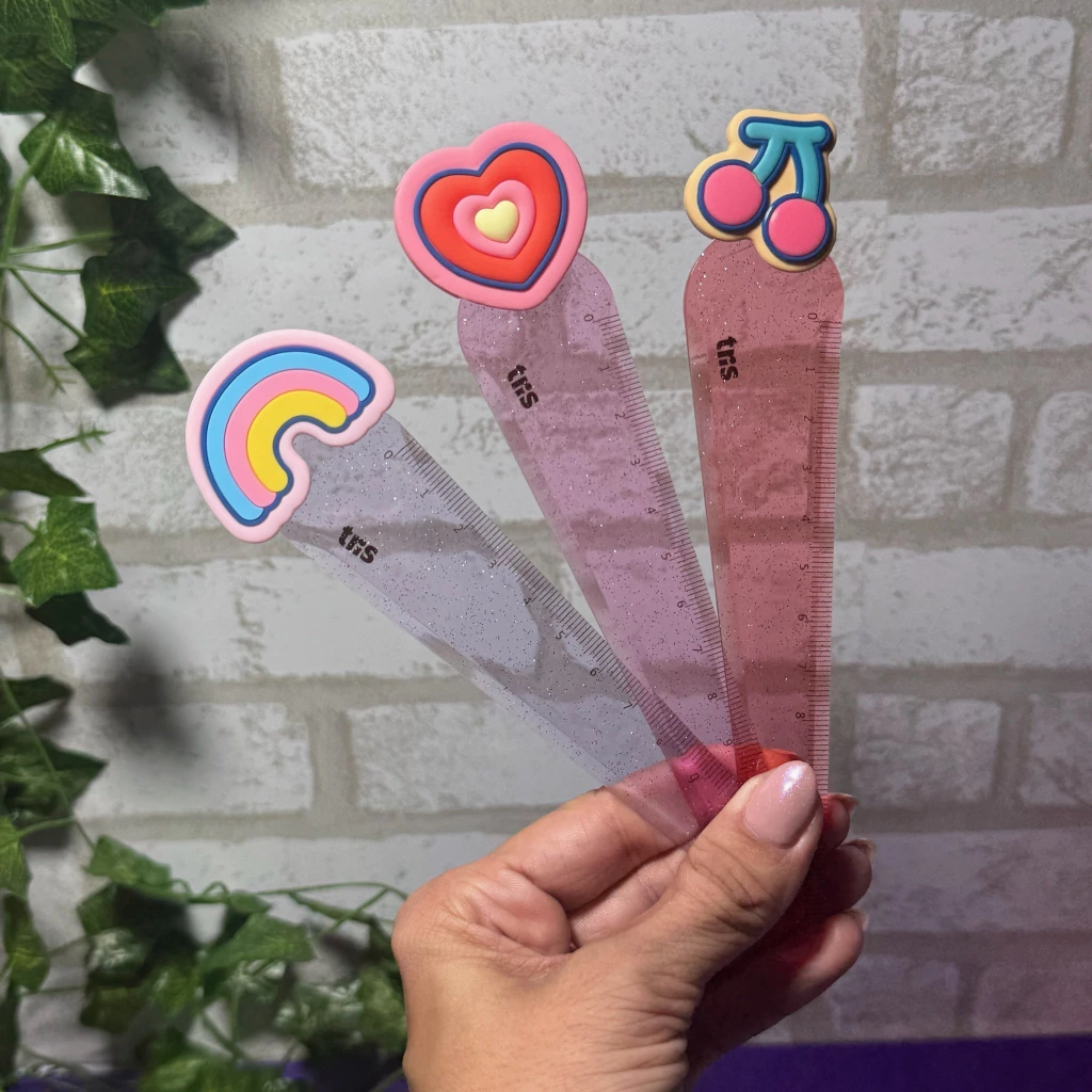 A régua Twinkle tem toppers embor rachados exclusivos super fofos! Tem corpo transparente colorido com glitter, e 12cm, cabe perfeitamente no seu estojo!
